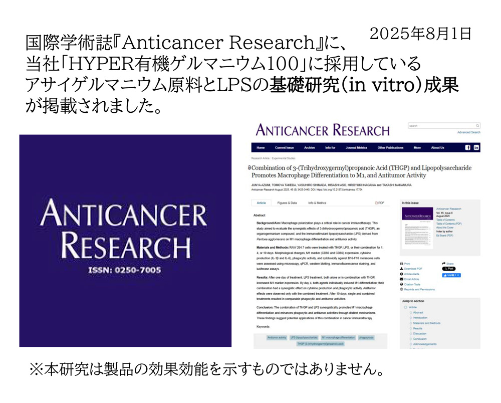 「アサイゲルマニウム」と命名された有機ゲルマニウムは水溶性で安全性が高く、優れた生理活性機能を発揮します。アサイゲルマニウムに関する論文は200本以上あり、豊富な学術研究や論文、臨床結果の報告も多く、国内で初めて、食品原材料の有機ゲルマニウムとして「健康食品の『安全性自主点検』認証登録制度」に認証登録されており、安心・安全な信頼できる有機ゲルマニウムとして体調や予防対策などの目的に期待されています。